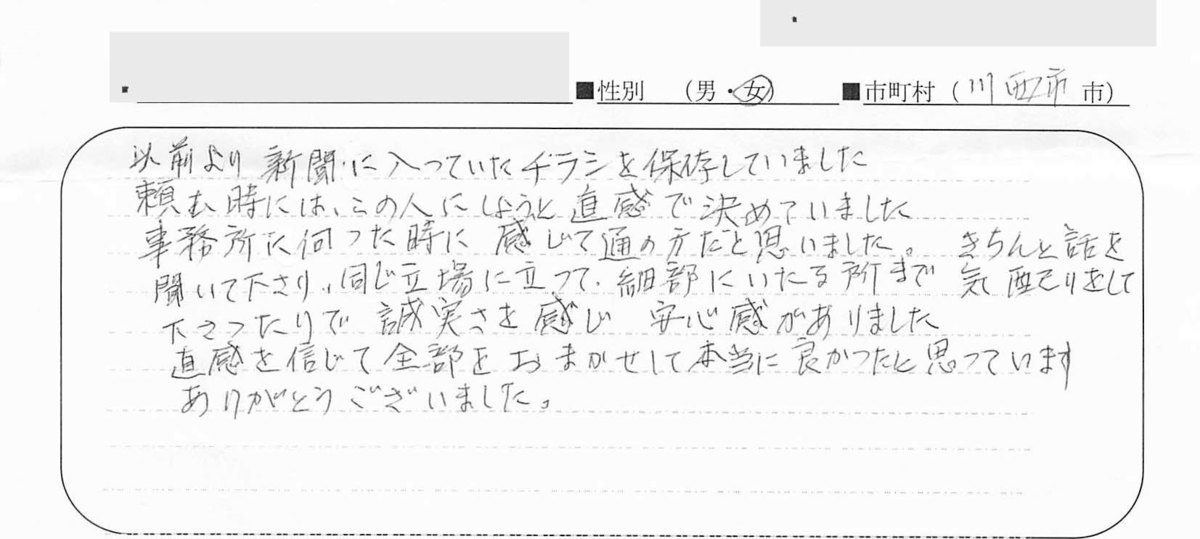 この度は大変お世話になりました。事務所に行くのは初めての事でしたので少々不安ではありましたが、丁寧に対応していただき、安心しておまかせする事が出来たと思います。もっと早く相談にいけば良かったと思っています。ありがとうございました。