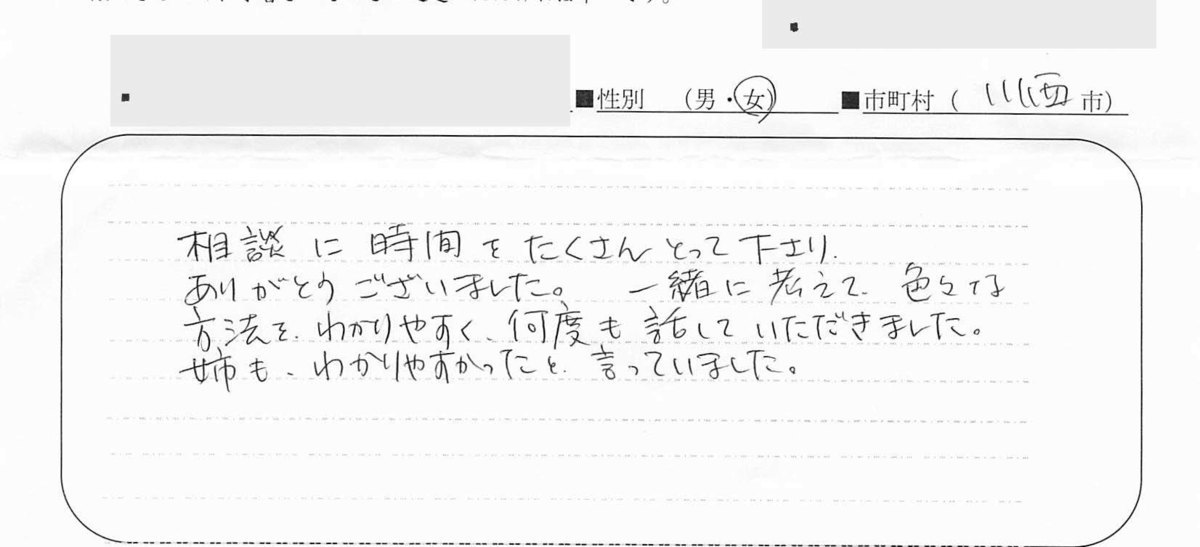 相談に時間をたくさんとって下さり、ありがとうございました。一緒に考えて、色々な方法をわかりやすく何度も話していただきました。姉もわかりやすかった、と言っていました。