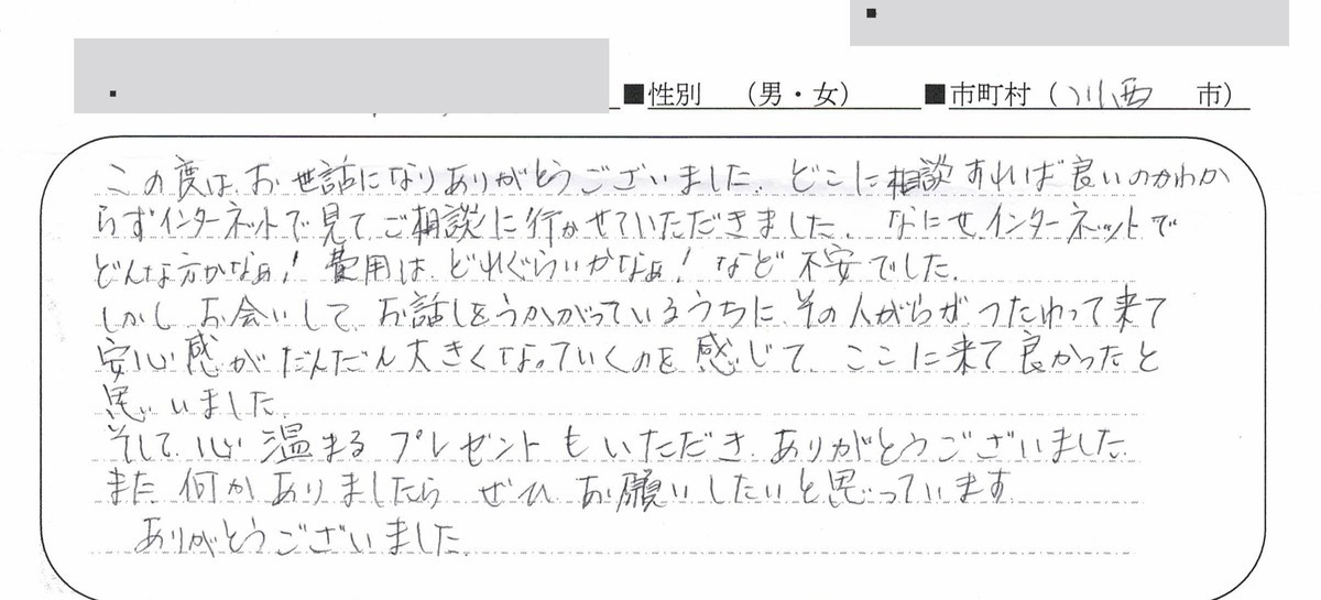 この度はお世話になりありがとうございました。どこに相談すれば良いのかわからずインターネットで見てご相談に行かせていただきました。なにせインターネットでどんな方かなあ!費用はどれくらいかなあ!など不安でした。しかし、お会いしてお話をうかがっているうちにその人がらがつたわって来て安心感がだんだん大きくなっていくのを感じて、ここに来て良かったと思いました。そして心温まるプレゼントもいただきありがとうございました。また何かありましたらぜひお願いしたいと思っています。ありがとうございました。