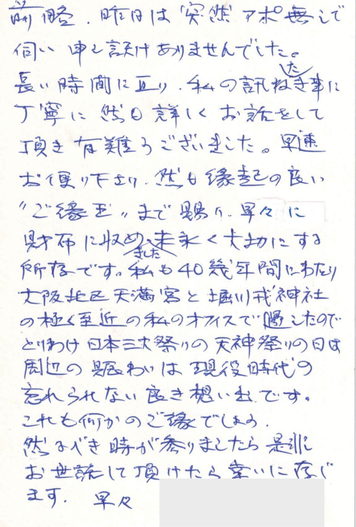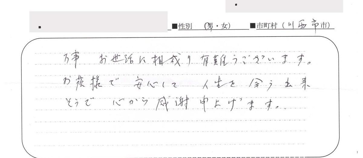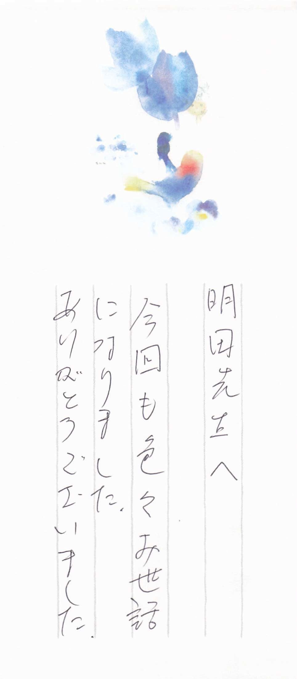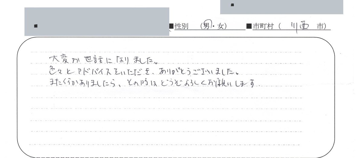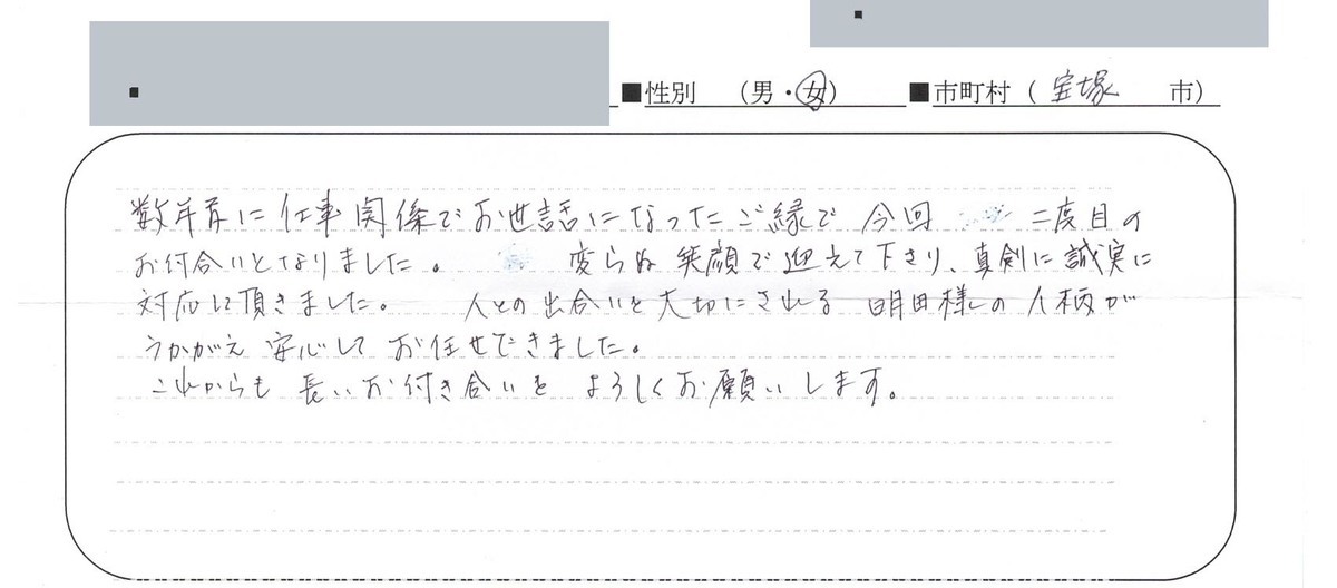 前略、この度は大変お世話になりありがとう御座いました。最初、どなたに相談しようかと迷いましたが、娘がパソコンで調べてもらったところ、明田様が良いということになり、この度お願いすることに致しました。妹と二人でお会いして、感じのいい方で良かったと話し合っておりました。不安はありませんでした。親切、丁寧な対応をして頂きましたので、感謝致しております。今後、又何かありましたら、よろしくお願い申し上げます。良い御家庭を築いていらして益々の御発展をお祈り申し上げます。乱筆乱文にて かしこ。