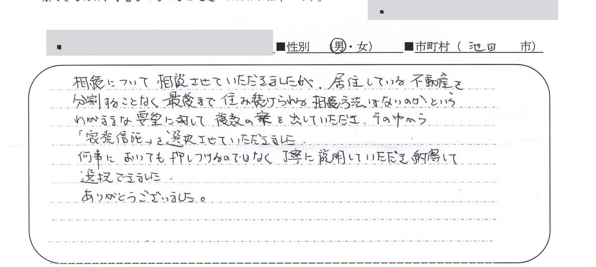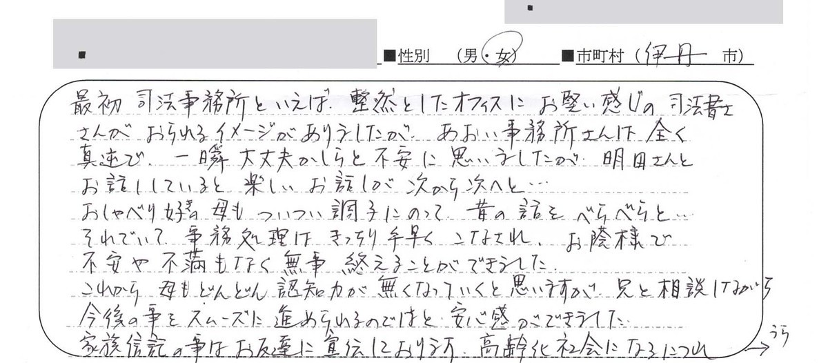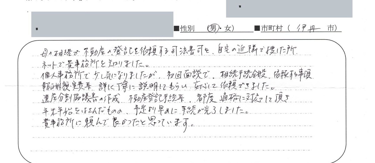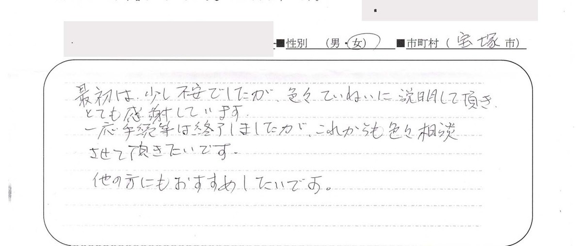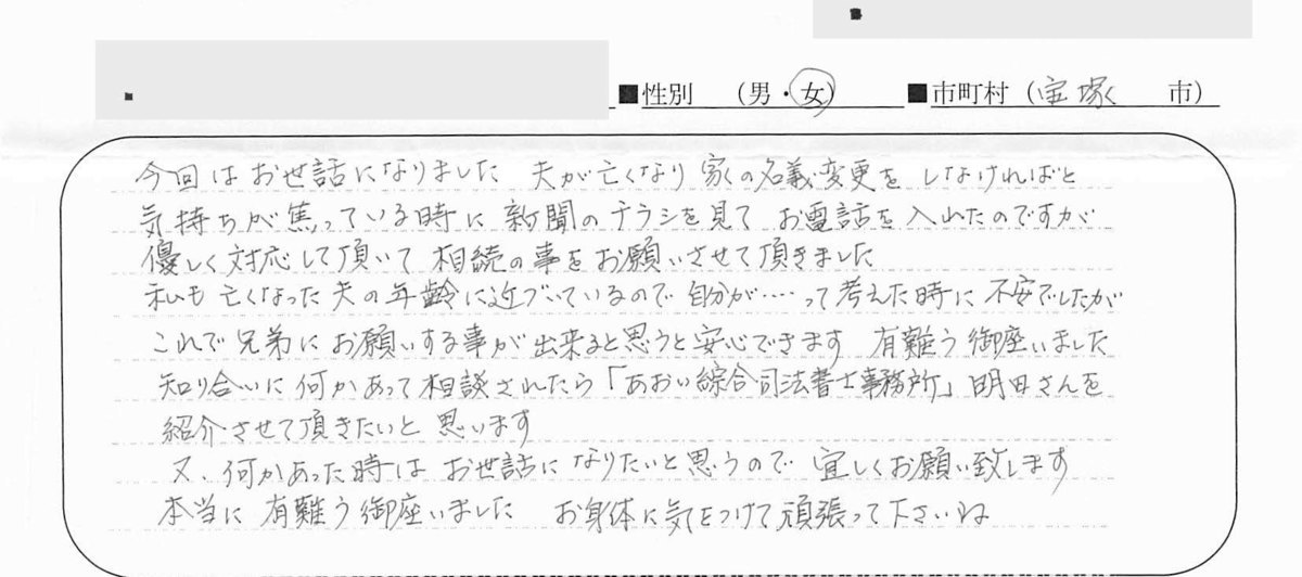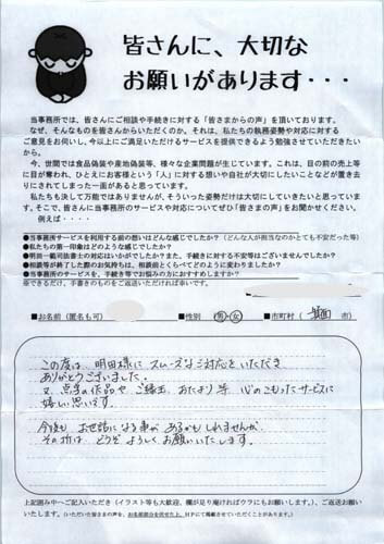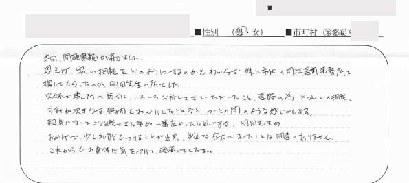 不動産の名義変更なんてした事もなかったし、どこでお世話になる事も考えつかなかったので、色々な手続きが終わってからにしようと思いました。市役所・銀行・公共料金など色々な手続きがあまりも多く、子供たちにも手伝ってもらいながら、何とか手続きが終わりました。事務所を利用する前は、気になっていたパンフレットを置いていたのを見たり、同じマンションの●●さんが前に利用されたのを聞いて家がどうなるか分からない不安もすごくあり電話して行ってみるとすごく親切に対応してわかりやすく手続きをして下さってすごく安心しました。(中略)ほんとうに色々お世話になりましてありがとうございました。まだ、火災保険の手続きが残っていますが以下は一安心しています。