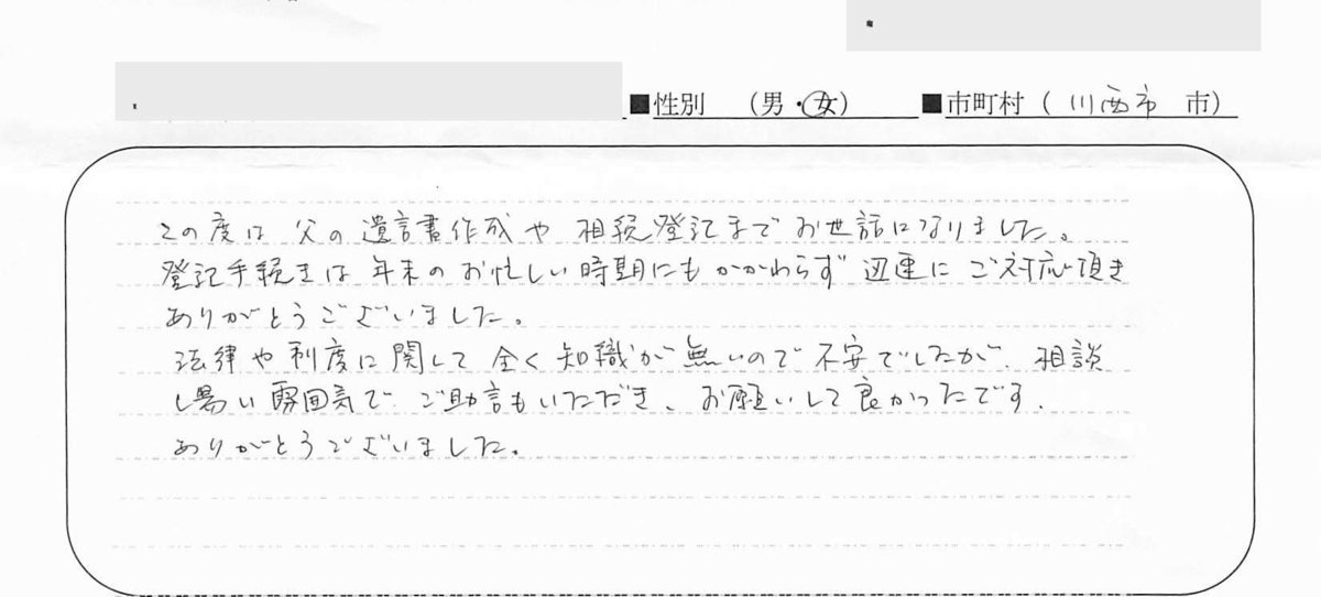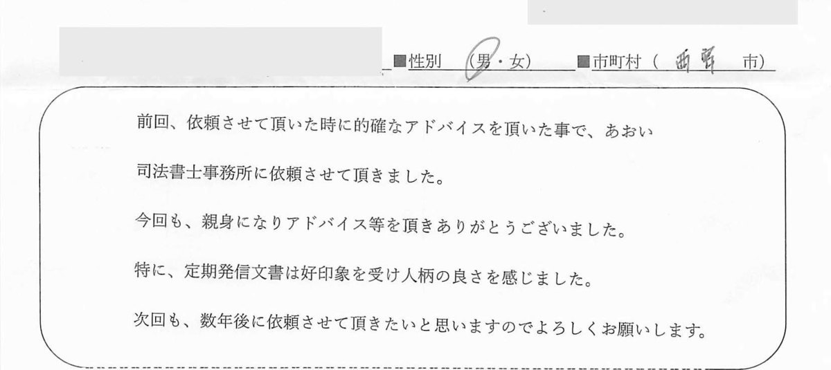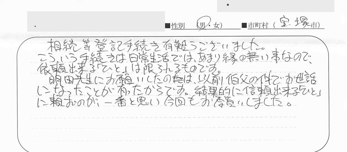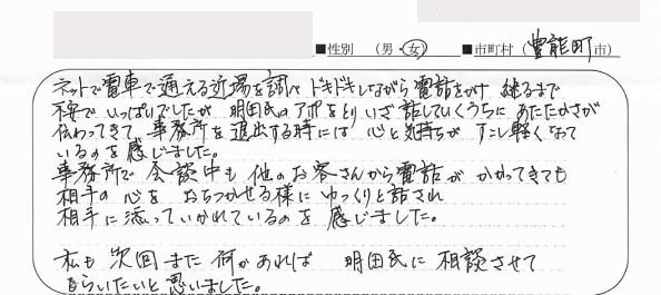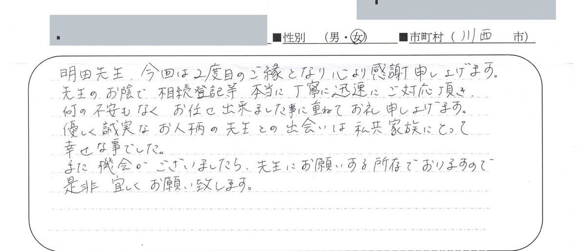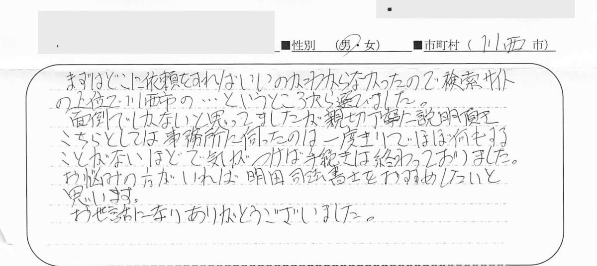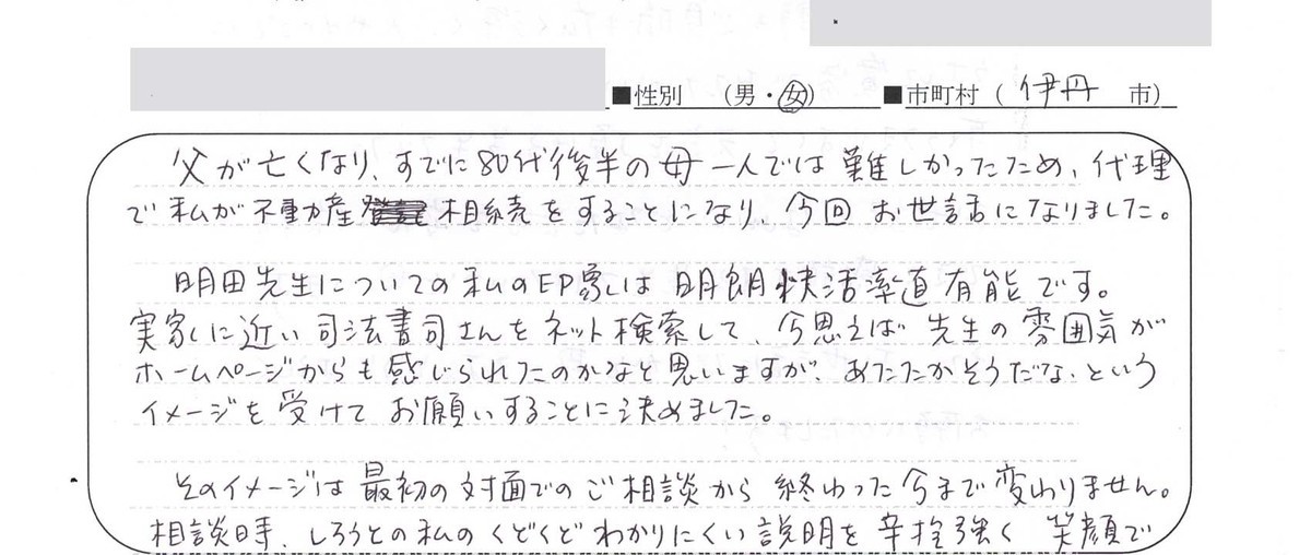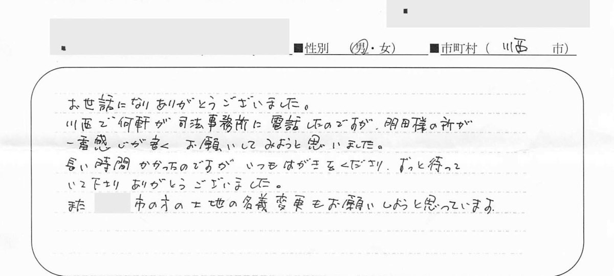 貴所を利用する前は、司法書士の看板を出しているところだと、どこも一緒だと思っていました。明田さんの第一印象はとてもお若く見えたので、事務所の所員さんかと思いました(笑)。その後、、先生だとわかった時は頼りになるのかな?大丈夫かな?と少し心配でした。しかし、きめ細やかな対応、3回のお手紙とお礼の品をお送り下さったこと、電話で手続きの進捗状況をお知らせいただいたことなど、明田さんの人となりがよくわかって、最初の心配は消えていきました。手続きも思ったより早く完了し、今はホッとしています。大変お世話になりありがとうございました。何分遠方ですがなにかありましたらまたどうぞよろしくお願いいたします。御自愛の上、ますますの御活躍をお祈り申し上げます。