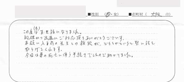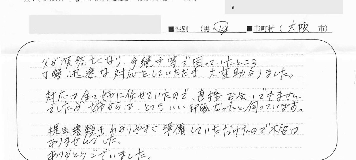 この度は、本当にありがとうございました。突然の夫の死によって、心も身体も疲れているにもかかわらず様々な事を解決しなくてはいけなくてわからない事ばかりでした。しかし、前回お世話になっていたので、何の心配も不安もありませんでした。できれば、直接お礼を申し上げたかったのですが残念です。今後、何かあればまたよろしくお願いいたします。時節柄、明田様、ご家族の皆様の健康をお祈りしております。