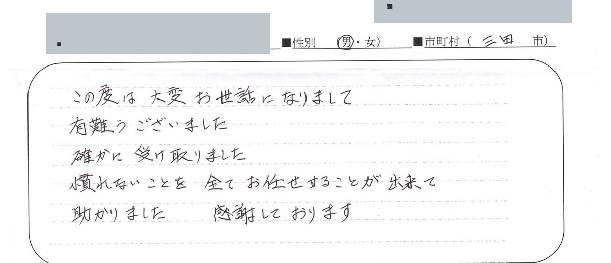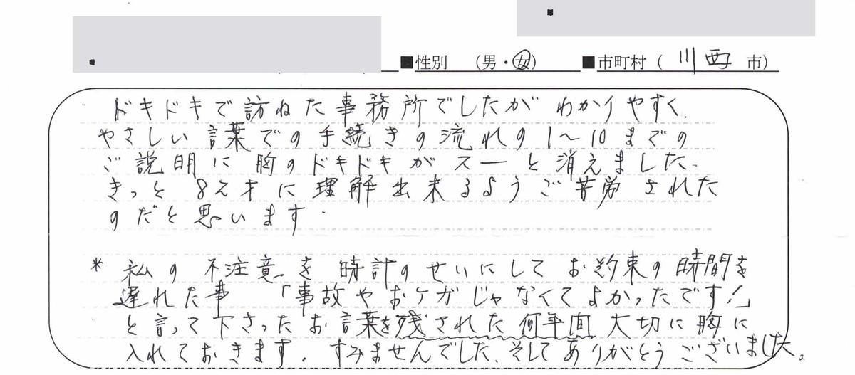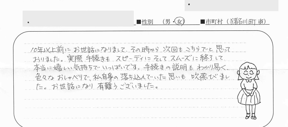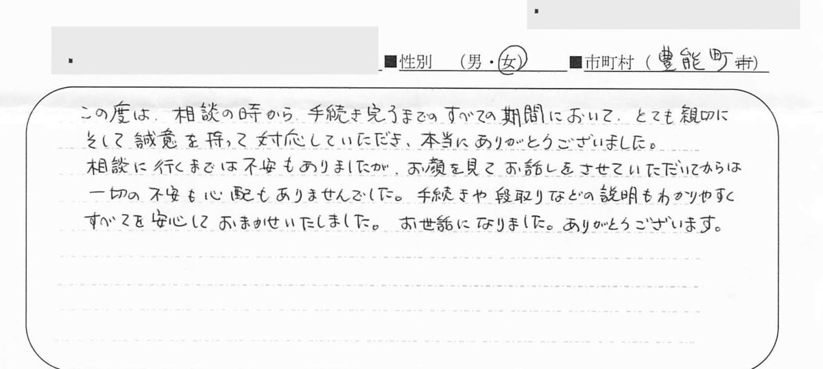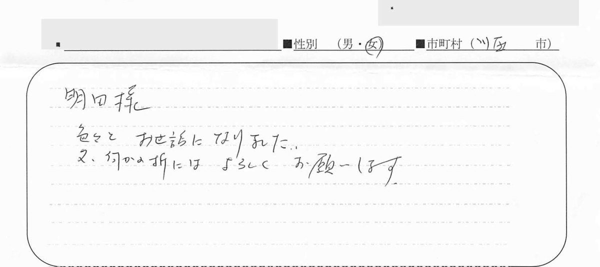 この度は、いろいろとお世話になりありがとうございました。初めは手続きをするのに不安がありましたが、明田さんのわかりやすい説明で、手続きもスムーズに行う事ができて、今は、手続きも完了しホッとしています。ありがとうございました。