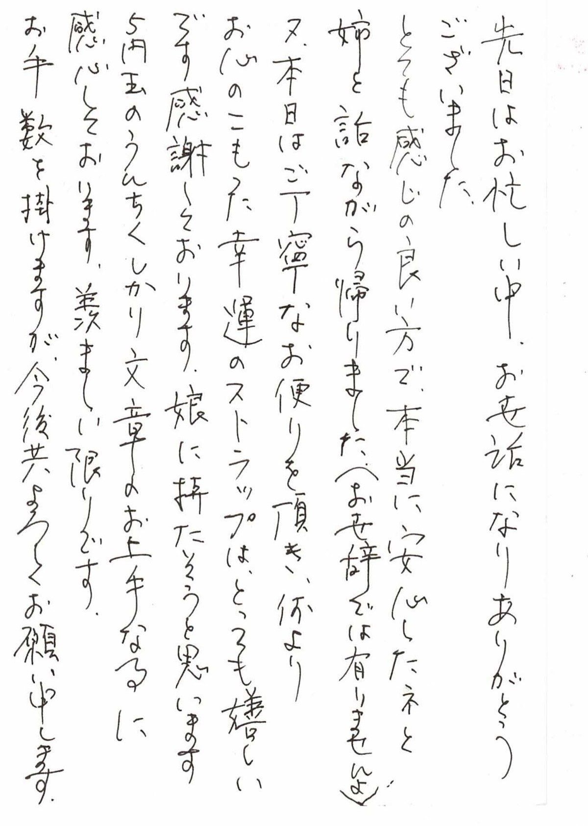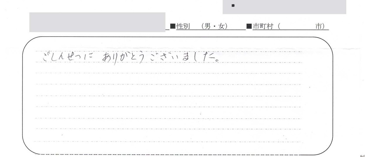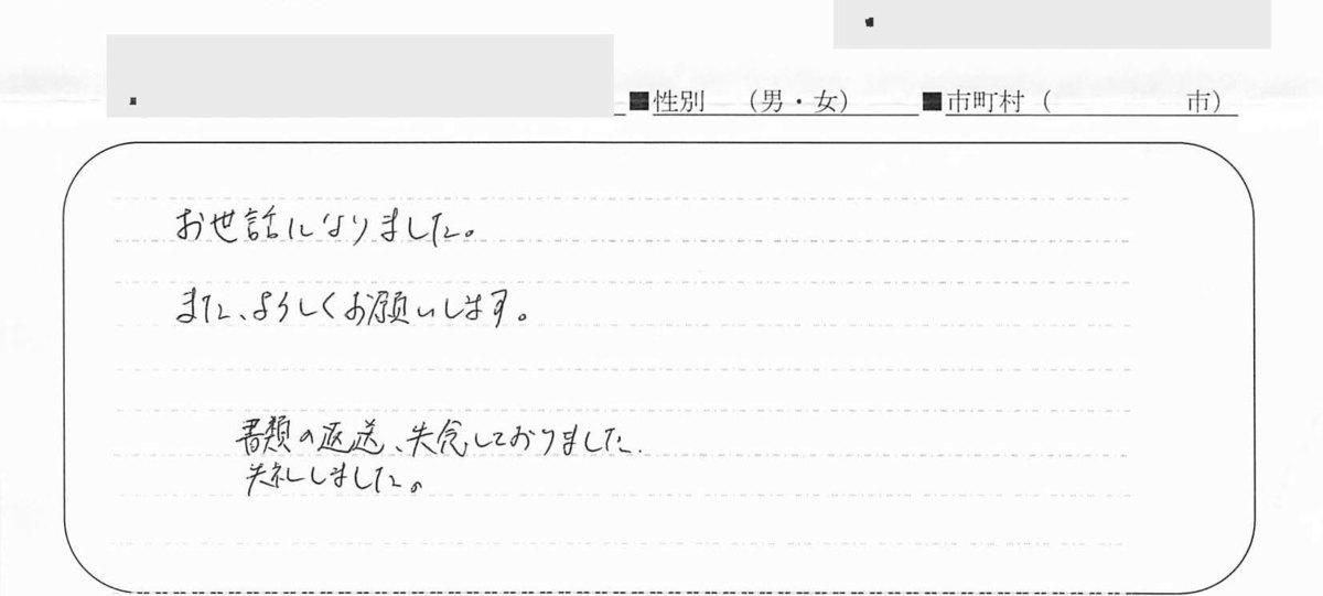 今回は本当にありがとうございました。何も知らないことばかりで不安でしたが、よくしていただき、間で手紙などいただき安心しました。本当に助かりました。ありがとうございました。