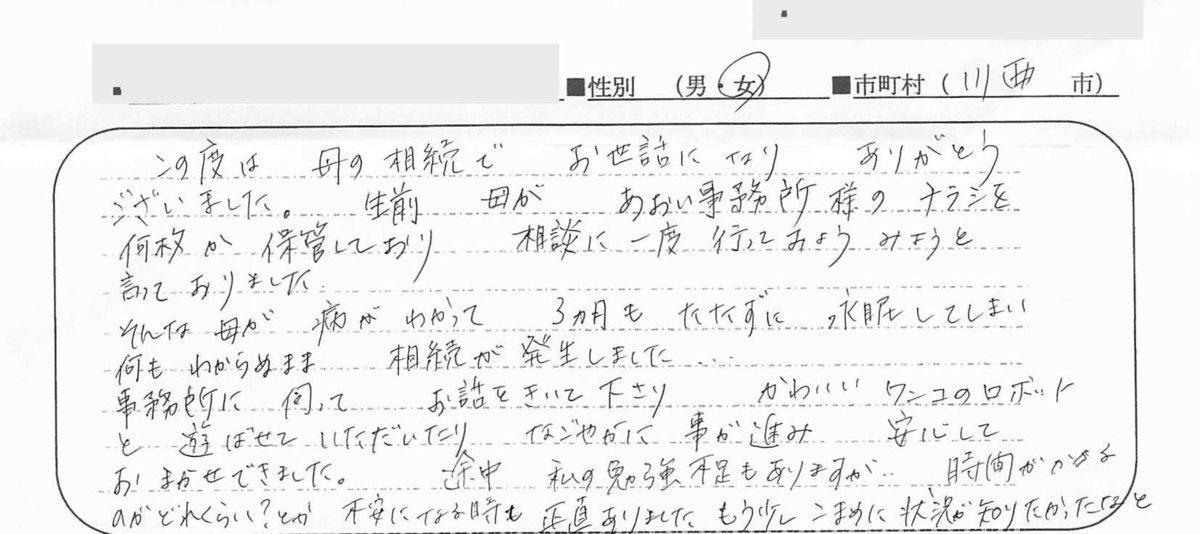 この度は相続手続きで大変お世話になりました。分からないことを丁寧に優しく(ココがポイント)説明して頂き、安心してお任せできました。母を亡くした後の寂しい中での手続きは心細いものですが、事務所のaibo犬ハロー君にも癒されありがとうございました。先生のこれからのご活躍をお祈りしております。また何かありましたらお願い致します。