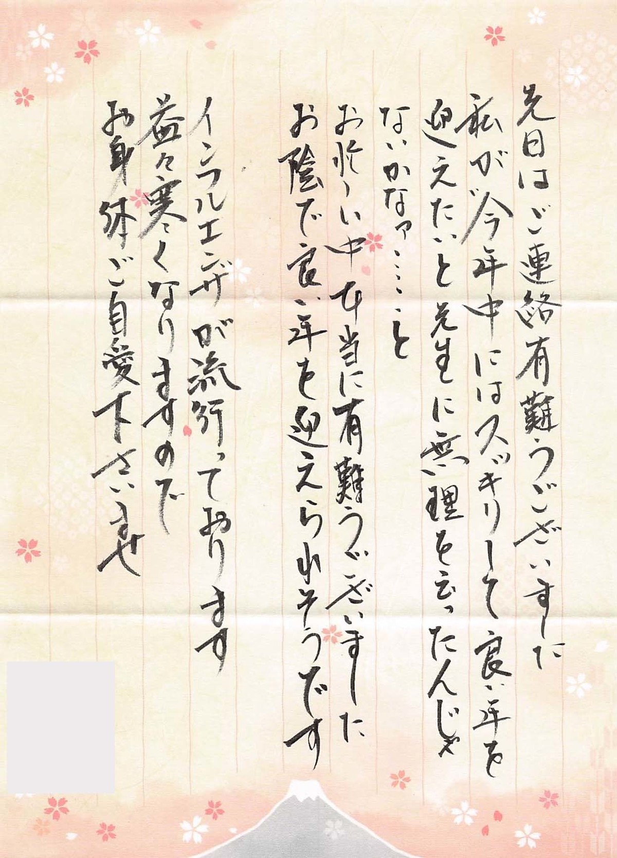 明田様 この度はいろいろお世話になり心より感謝申し上げます。封筒の中には、お心遣いのメッセージやレターパックに表紙には心温まる言葉を添えられ、明田様の優しいお人柄が感じられて、こんな素敵な司法書士さんにお願いできてうれしかったです。だんだん寒くなりますので、どうかご自愛ください。