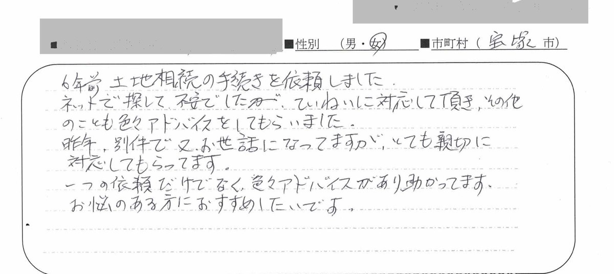 法務局で手続きをするのを(法務局に)聞きに行ったときに、心無い言葉を言われ、もう手続きをしない、と思い、父が亡くなって15年間もそのままにしていたのですが、長くおいていたので、事務所の方にも何か言われるかと思っていましたが、優しくわかる様に説明して下さり、伺って良かったと思いました。ご近所の方に手続きをしないといけない様になったら、教えてと頼まれました。本当にありがとうございました。書類もきちんとしたケースに入れて、風呂敷に包んで送って頂き、本当に大切に扱って頂き、ありがとうございました。