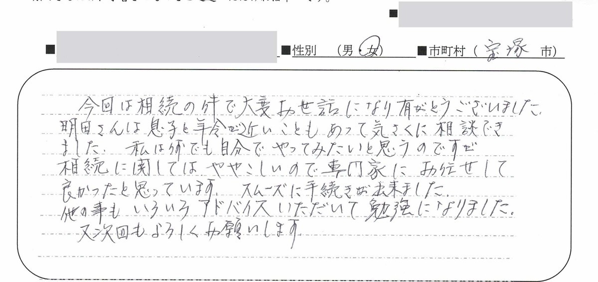 今回は大変お世話になりありがとうございました。相続の手続きをどなたに依頼すればいいのかと長い間悩み手続きも進まずにおりましたが、明田様の折り込みチラシを見て優しさを感じお願いすることにしました。お会いするまでは不安でいっぱいでしたが笑顔で迎えて下さり私達に分かる様に優しく丁寧に説明して頂きました。緊張していた気持ちが和らぎ皆、笑顔で安心して帰る事が出来ました。明田様にお願いして本当に良かったです。また、何かありましたらよろしくお願い致します。