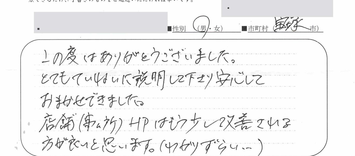 せっかくのご意見は無駄にしないよう、皆さんに少しでもご満足いただけるよう事務所一同頑張っていきたいと思います。