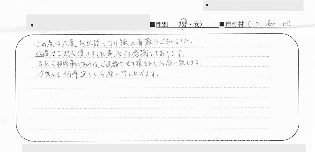 この度はお世話になりました。長年気がかりだったことが解決して安堵しております。息子が決めてお願いすることになったので、不安とかなく進みました。次回、相談が必要だったり、友人からの相談があればお声かけさせていただけると思います。丁寧に対応していただきありがとうございました。