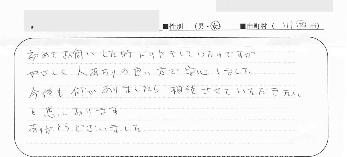 このたびはお世話になりました。とても丁寧でわかりやすい対応で安心しました。私の先生の感想は、人と人とのつながりを日頃より意識されていて、そして人情味あふれる人柄だなあと感じました。又何かあればお願いしたいと思います。その時は又、よろしくお願いいたします。