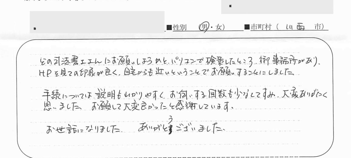 この度は、大変お世話になりありがとうございました。分からないことが多く、不安でしたが細かく説明して頂け、手続きの中で起こり得る可能性も教えていただき安心してお願いできました。事務所の中も落ち着いた雰囲気で居心地が良かったです。面談時間も急にもかかわらず対応いただき、無事に手続きが終わった後はお任せそして良かったと思っております。機会があればまた、ご相談させて頂きたく思って居ります。乱筆乱文のほど、ご容赦願います。