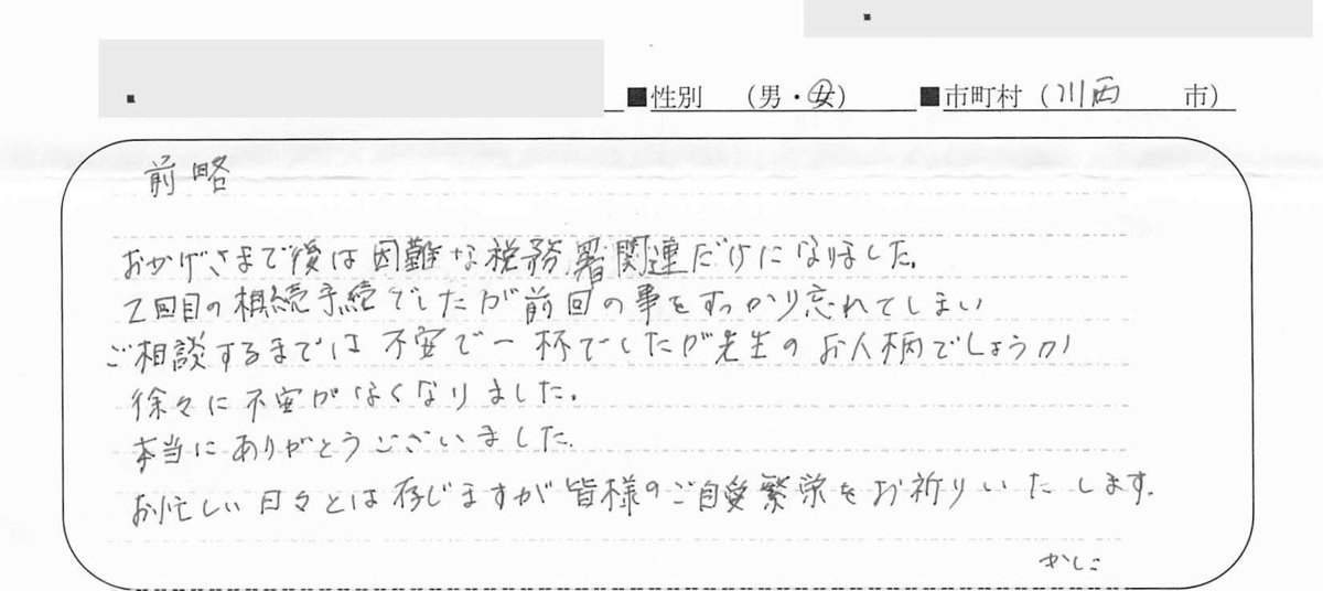 前略 この度は、本当に有難うございました。当事者に寄り添った、心のこもった「ご縁」をいただき改めてお礼申し上げます。素人で出来る様なものでなく、悩んでいた中で、いろいろお話させていただきました。その中でいろんなご提案で、無事に手続き出来てまさしく肩の荷がおりた、という感じです。「お手紙」と「ありがとう」に背中を押された「ご縁」で先生にお願いして良かったと思っています。本当に感謝です。今後も「ご縁」があるかと存じます。何卒、よろしくお願いいたします。 草々