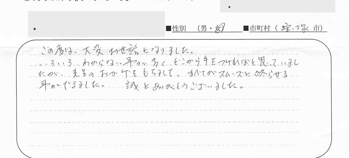 不動産の名義変更なんてした事もなかったし、どこでお世話になる事も考えつかなかったので、色々な手続きが終わってからにしようと思いました。市役所・銀行・公共料金など色々な手続きがあまりも多く、子供たちにも手伝ってもらいながら、何とか手続きが終わりました。事務所を利用する前は、気になっていたパンフレットを置いていたのを見たり、同じマンションの●●さんが前に利用されたのを聞いて家がどうなるか分からない不安もすごくあり電話して行ってみるとすごく親切に対応してわかりやすく手続きをして下さってすごく安心しました。(中略)ほんとうに色々お世話になりましてありがとうございました。まだ、火災保険の手続きが残っていますが以下は一安心しています。
