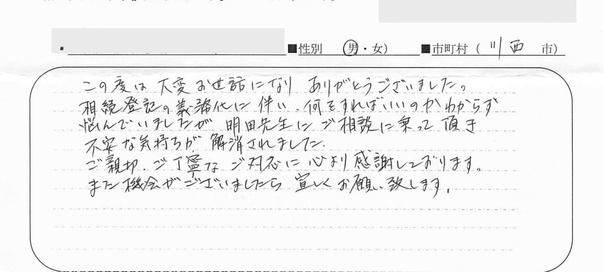 不動産相続は初めてだったので、多少、不安は有りましたが、明田司法書士とお会いし、話、相談していくにつれ不安は無くなりました。私は、地域の役柄よく不動産相続の話は出ます。もし、相談を受けた時には、明田司法書士を紹介したいと思います。